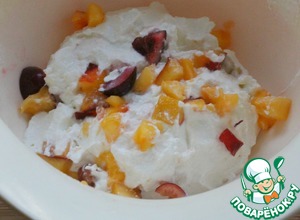 Взбиваем миксером творог с фруктами и прямо под лопасти льем желе.