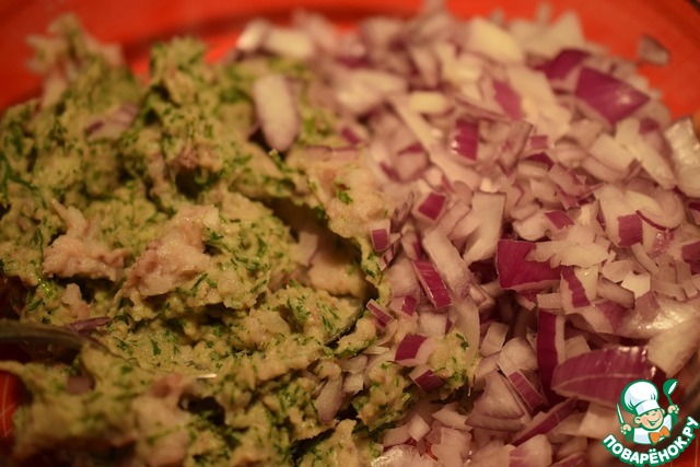 Вынимаем селедку, кладем в миску, добавляем измельченный лук