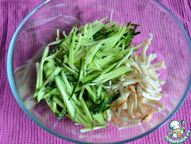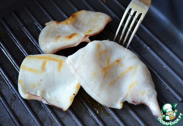 Кальмары сварить. Остудить, промокнуть, смазать растительным маслом