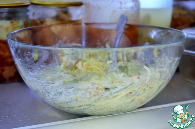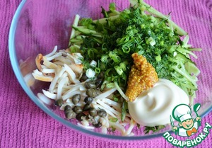 Зелень нарубить, в салатник. Заправить майонезом и горчицей.