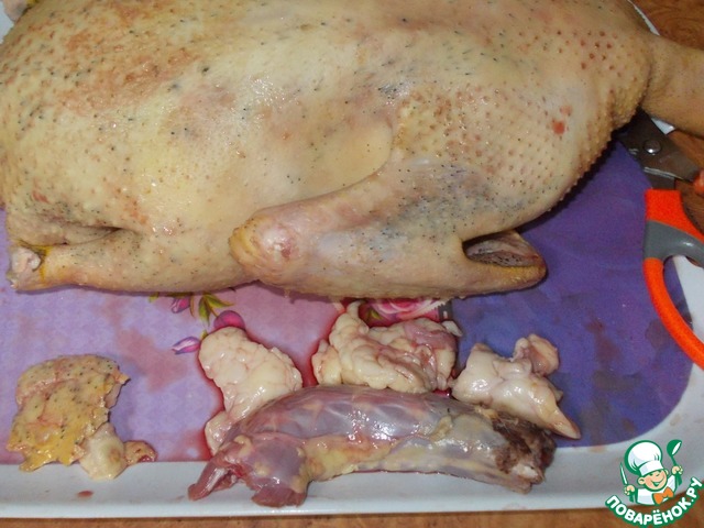 По истечении времени аккуратно (!) извлекаем утку из духовки и тонким ножом протыкаем в районе бедренного сустава.