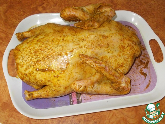 Смазываем маринадом всю тушку внутри и снаружи. -