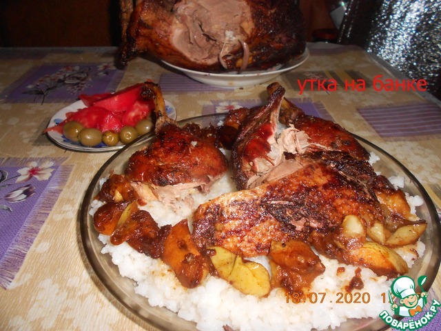 У нас дома утка - не частый гость на столе... И когда появляется, то в основном, фаршированная рисом и с яблоками. Конечно, эта птица хороша в любом виде, но хочу предложить вам приготовить ее вот таким способом - на банке! Тем более, на нашем сайте подобного рецепта нет! Добро пожаловать в гости!