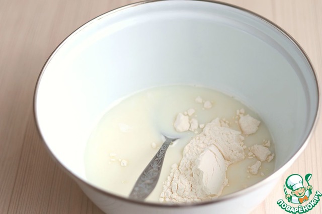 В миску добавить 200 мл. молока и слегка подогреть. Далее добавимть сахар (1 ст. ложка), доьбавить 2 ст. ложки муки.