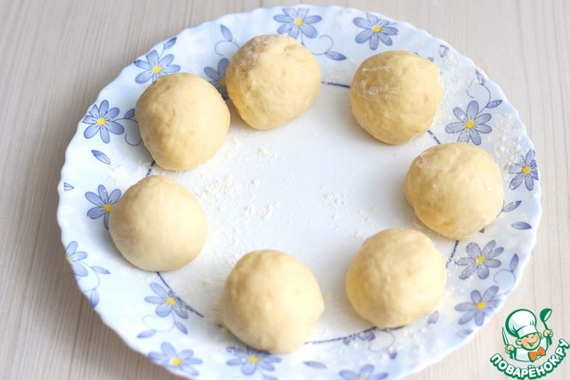 Тесто разделить на равные кусочки, в моем случае вес каждого кусочка 50-55 гр.. Кусочки подкатать в шарики, выпожить шарики на плоское блюдо или разделочую доску и прикрыть полотенцем или пищевой пленкой, что бы не произошло заветривание кусочков.