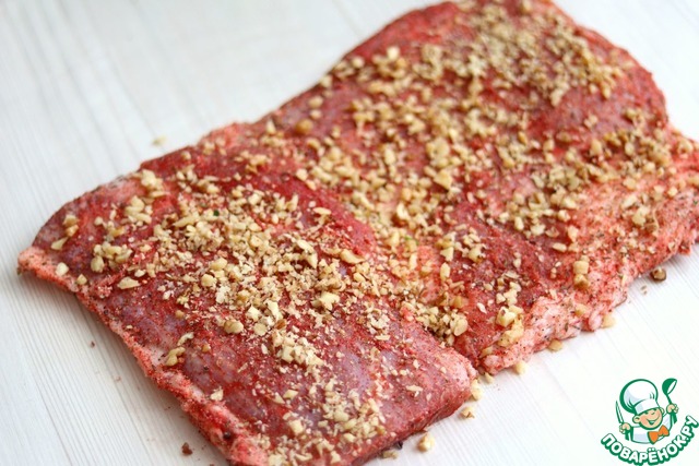 Натереть подчеревок слегка массируя с двух сторон смесью пряностей. Затем на внутреннюю часть подчеревка добавить обжаренные и порубленные грецкие орехи, распределить ореховую крошку по всей поверхности подчеревка.
