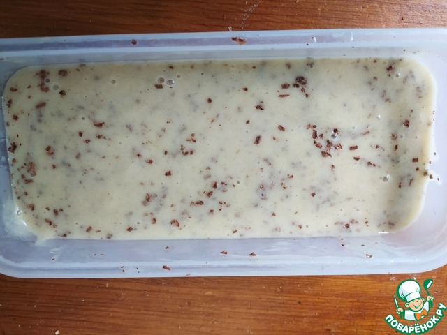 Переливаем в контейнер. И отправляем в морозильную камеру часов на 6, а можно и на ночь. Я добавила еще шоколадную крошку.