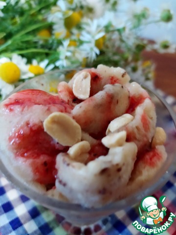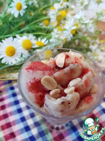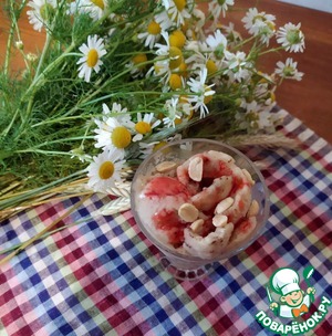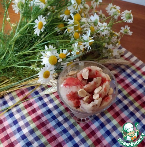 Раскладываем в пиалы. Так как десерт получается очень сладкий, я полила его вишневым сиропом (кисловатым).