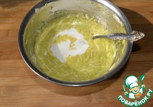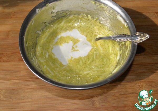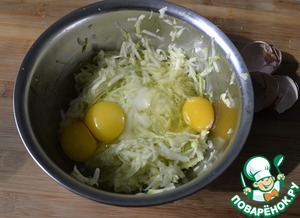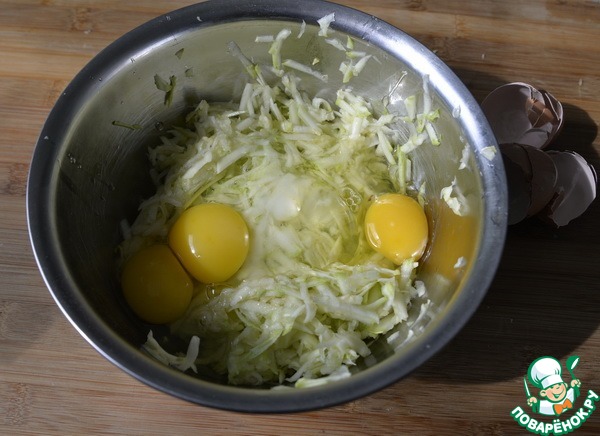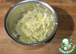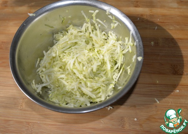 Цукиини трём на среднюю тёрку, солим, перемешиваем, оставляем на 10 минут. Слегка (без фанатизма) отжимаем лишнюю жидкость.
