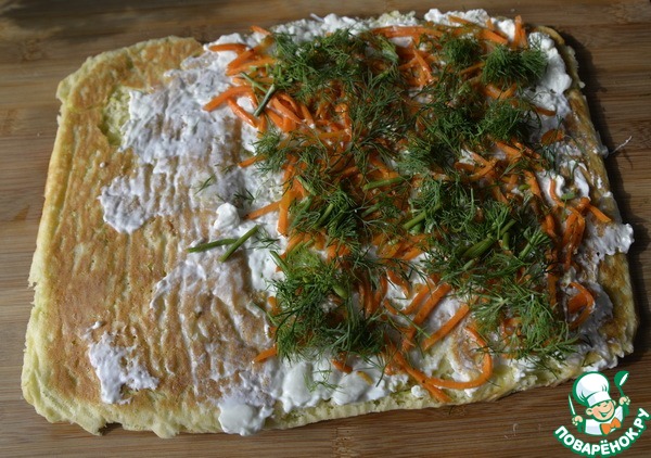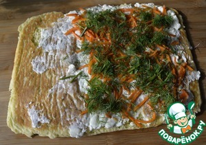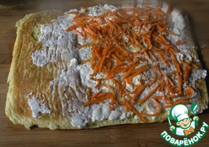 Смазываем остывший пласт кремом из творожного сыра со сметаной, не доходя до края. Сверху кладём морковь по-корейски.