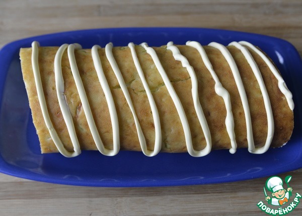 У остывшего рулета отрезаем ровно края, наносим полоски из майонеза с помощью кулинарного пакета. Если вы против майонеза, то можете сделать полоски из крема, которым промазывали рулет, оставив заранее 2 ст. ложки.