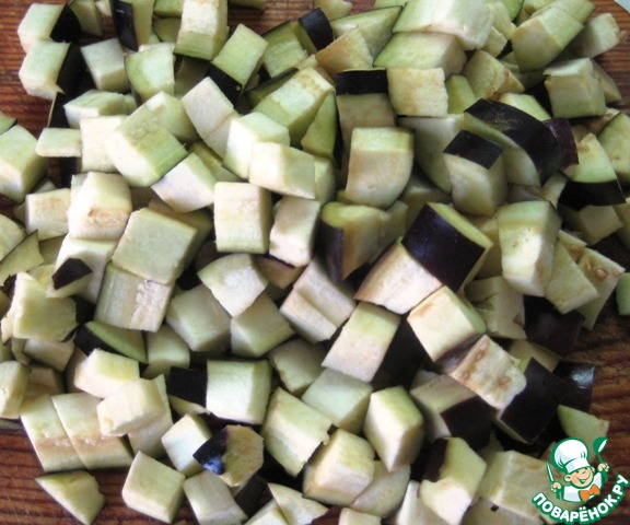 Нарезать небольшими кубиками баклажаны.