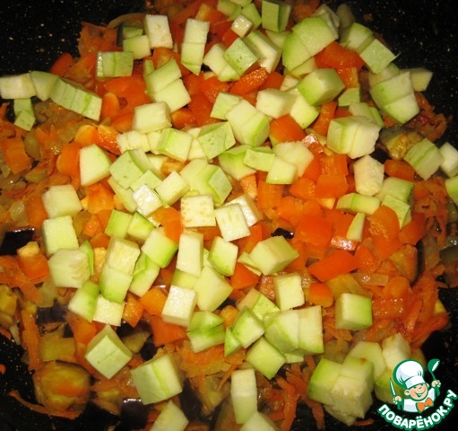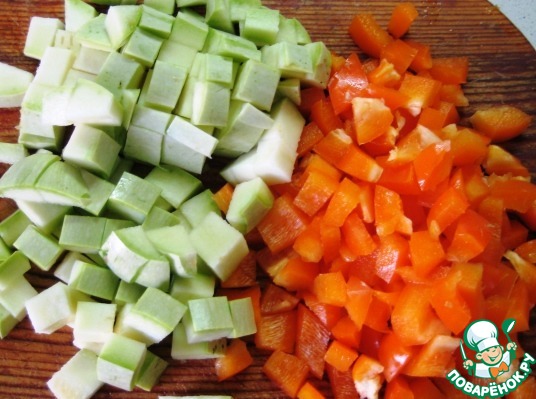 Нарезать кубиками кабачок и сладкий перец.