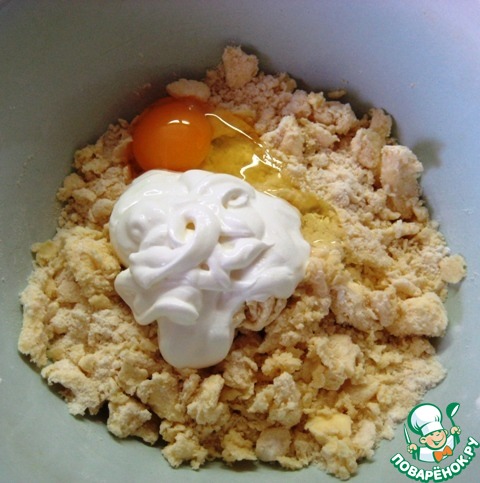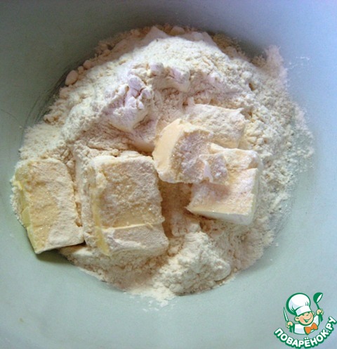 в миске соединить кусочки холодного сливочного масла, сахар, соль и муку. Перетереть руками в крошку. -