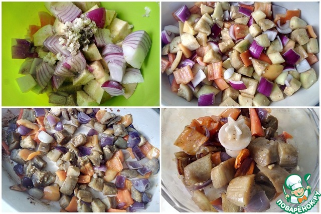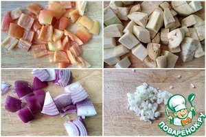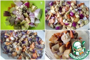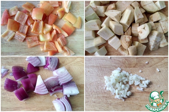 Баклажан, перец и лук очистить и нарезать на кусочки ~2 см.