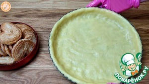 • Смешиваем муку и разрыхлитель, перетираем с маслом, соединяем обе смеси, замешиваем тесто и распределяем его по форме
