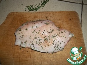 Куриную грудку вымыть, обсушить. Сделать неглубокие надрезы в виде сетки, для того чтобы курочка впитала специи и равномерно прожарилась. (маленькая хитрость для красивой подачи куриной грудки). Натереть солью и смесью специй. Розмарин порубить и обвалять в нем куриную грудку со всех сторон.