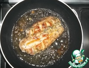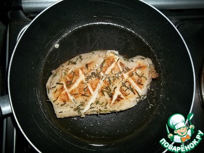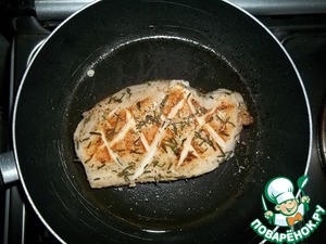 В сковороде разогреть оливковое масло, выложить куриную грудку, обжарить с каждой стороны на среднем огне примерно по 4 минуты, прижимая вилкой, до легкого румянца.