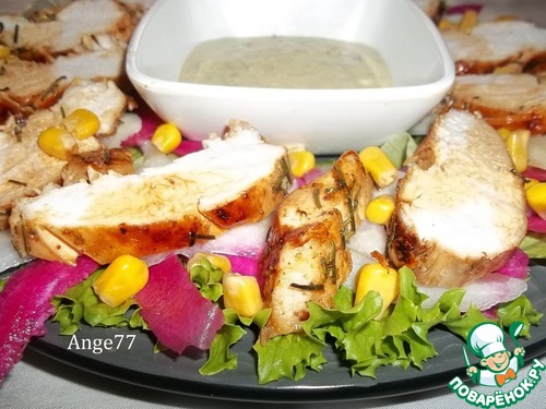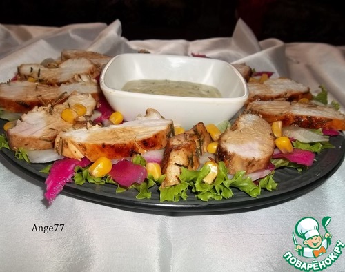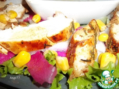Пока готовится куриная грудка, подготовить овощи. Листья салата промыть и обсушить. Огурец (твердую часть), так же как и дайкон нарезать лепестками с помощью овощечистки. На середину плоской большой тарелки поставить соус, вокруг выложить порванные рукой листья салата, маринованный дайкон (освобожденный от маринада), огурец. Куриную грудку нарезать ломтиками, выложить на овоши. Немного консервированной кукурузы украсит и придаст мягкость блюду. Полить курочку выделившимся при нарезке соком.