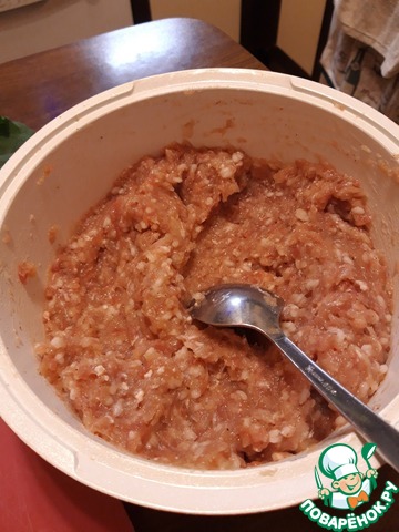 Смешайте фарш (я делаю куриный со свиным) с подвареным рисом, специями и солью.