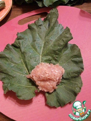 Промойте и обсушите листья ревеня. Нужно брать средние - маленькие неудобно заворачивать, большие жесткие. На лист ревеня положите ложку фарша, можно побольше - как вам вкуснее и удобнее, заверните как голубец.