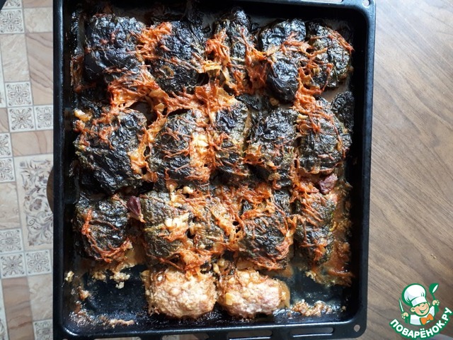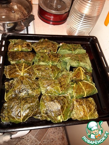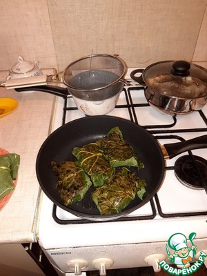 На разогретой сковороде на ложке растительного масла обжарить наших голубчиков по минуте - полторы. Листья изменят цвет и станут мягкими