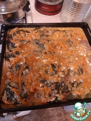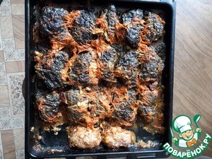 Следите за ними, духовки у всех разные - как только видите, что соус стал активно испаряться, выключайте - в нем самый смак. Подождите пока духовка остынет и доставайте. Не пугайтесь, что листья черные - это они не сгорели, а просто изменили цвет