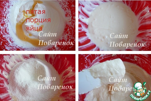 Яйца вливать небольшими порциями в 7-8 приемов, каждый раз взбивая не менее 1мин. -