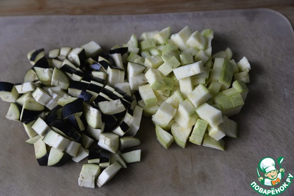 Молодой цуккини и баклажан режем кубиками. Если опасаетесь, что баклажан будет горчить, то срежьте кожуру.