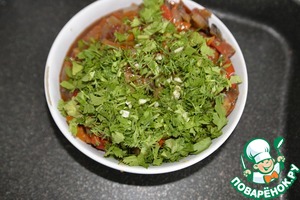 Подаём закуску охлаждённой. При подаче посыпаем рубленным чесноком и зеленью, у меня укроп и кинза.