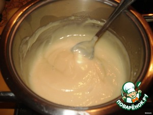 Тем временем готовим крем: в кастрюльке растопить масло, добавить муку, хорошенько размешать, влить теплое молоко и варить , непрерывно размешивая, до получения однородной массы, добавить сахар, размешать и снять с огня. Взбить яйцо и белок и вылить в немного подостывший крем, в конце добавить ванилин. Должен получиться гладкий ароматный крем.
