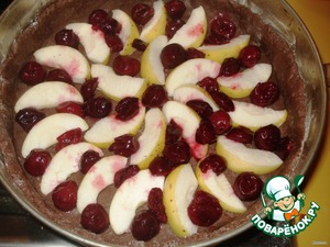 Тесто разложить по форме с бортиками, выложить на него порезанные дольками яблоки и вишню (у меня была замороженная, можно любую)