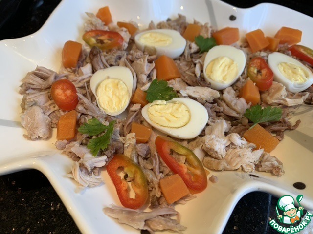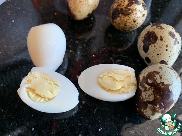 Сверху выложите половинки перепелиных яиц, морковь, острый перец и листики петрушки.