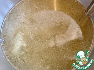 Прогрейте 1,2 л бульона (не более 60 градусов), добавьте желатин, размешайте до полного растворения.