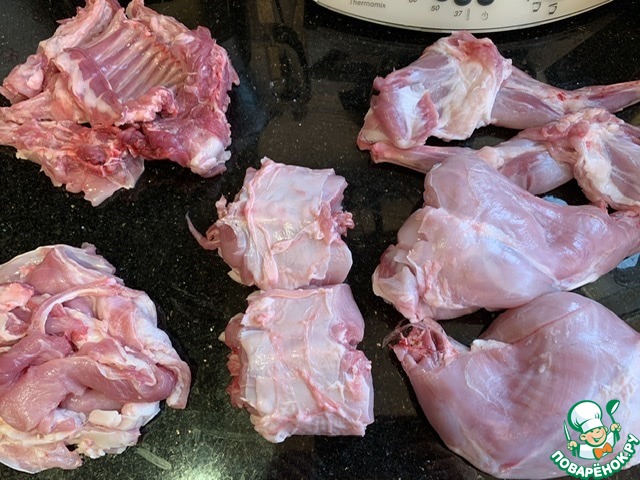 Сначала разделываем кролика: из тушки достаньте почки, печень, легкое и сердце (их потом можно будет обжарить с луком и заправить кашу). Отделите по суставам задние и передние лапы. Начиная с области таза, острым ножом отделить филе вдоль ребер и спины. Отделите рёбра. Спинку разделайте на 2 части + шея и задняя часть позвоночника. Лапки кролика и 2 ровные части спинки убираем в морозилку (их я готовлю в мультиварке в сливочном соусе).