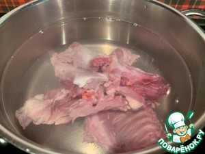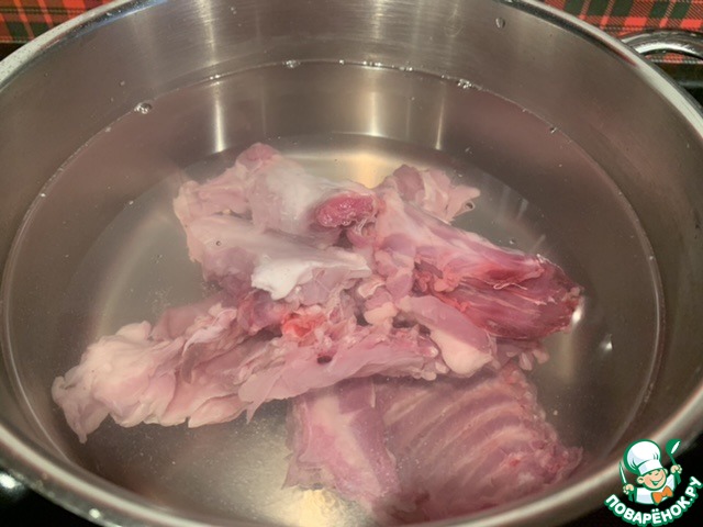 Филе и остальные части кролика (шея, рёбра и задняя часть позвоночника), положите в кастрюлю, залейте 2 литрами холодной воды.