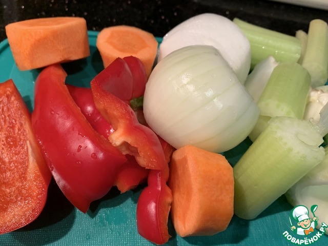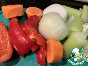 Добавьте крупно нарезанные лук, морковь, сельдерей и болгарский перец.