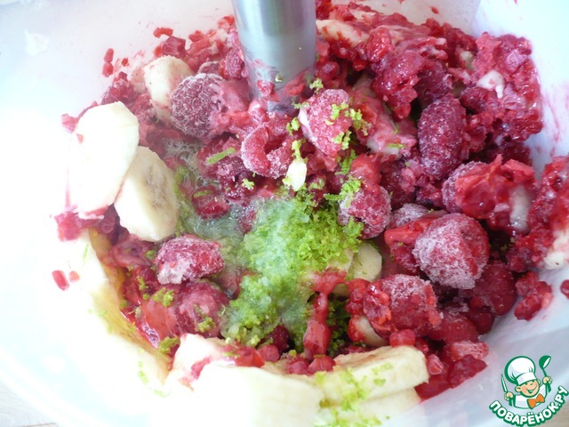 Затем достаем из морозилки бананы и малину, перекладываем в чашу блендера, добавляем цедру лайма (только зеленую часть), выжимаем сок из одного лайма. По желанию можете добавить листочки мяты (чтобы сорбет приобрел освежающий аромат и вкус).