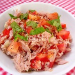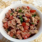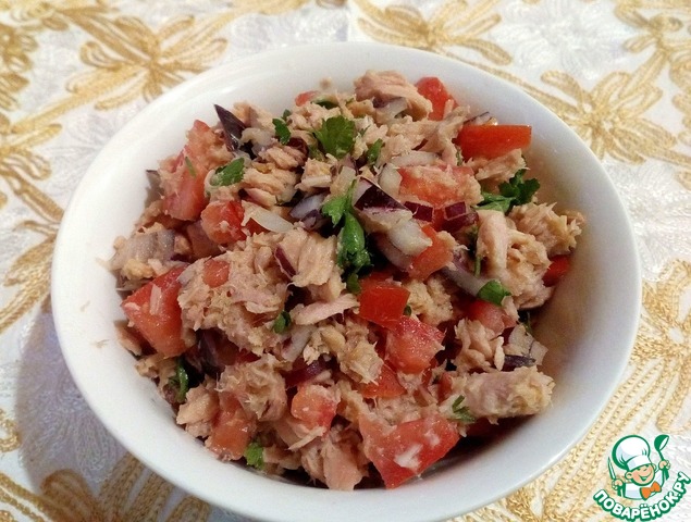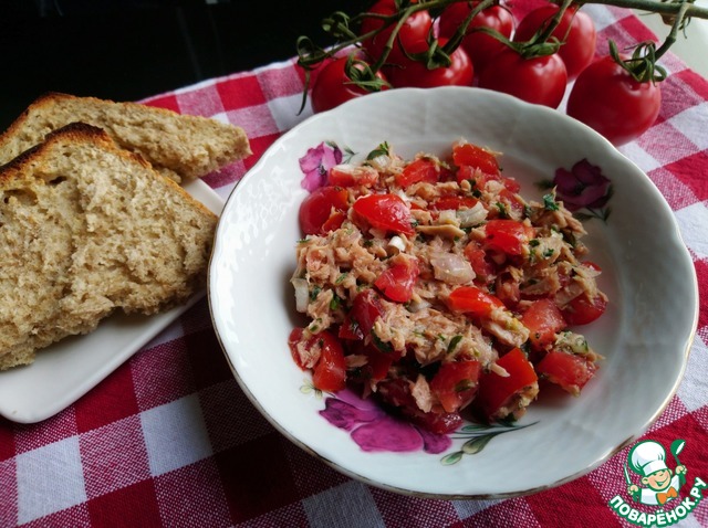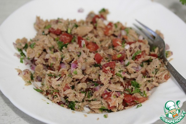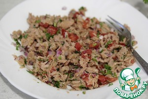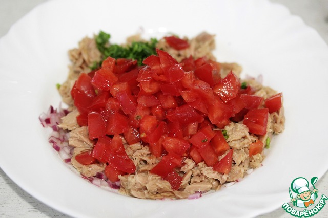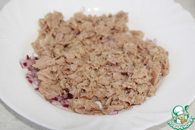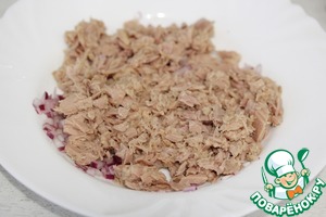 С тунца слить сок, размять кусочки рыбы вилкой.