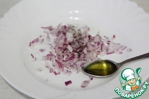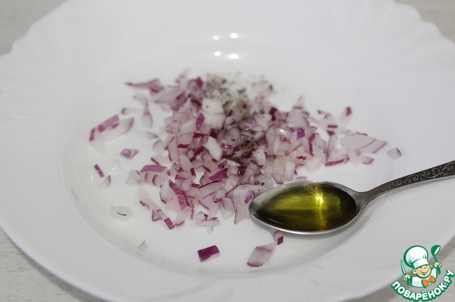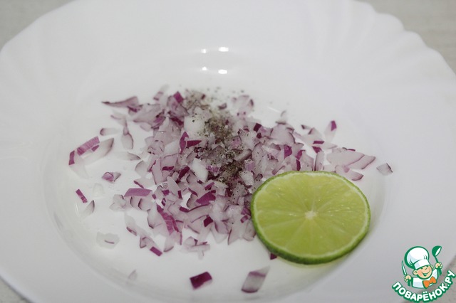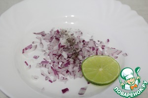 Лук мелко нарезать, приправить солью и черным молотым перцем, щедро полить лаймовым соком.