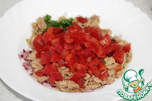 Добавить помидор, очищенный от семян и нарезанный на небольшие кусочки.