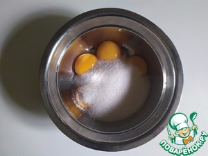 Желтки с сахаром поставить на водяную баню. Постоянно взбивать, пока сахар не растворится и крем не загустеет. Довести до 68-70 градусов и снять с огня.