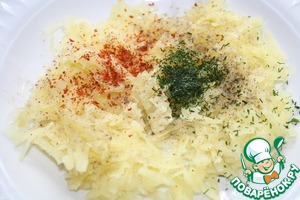 Натереть картофель. Т. к. я не люблю клелость натертого картофеля, то я заливаю его кипятком и даю постоять около 10 минут, а затем хорошо промываю под проточной водой. В оригинале его просто натирают.