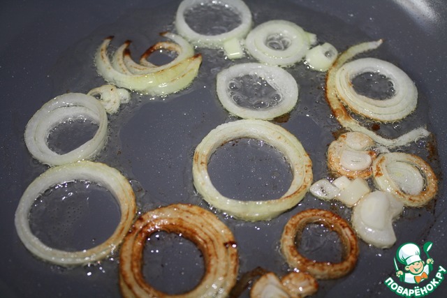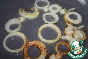 Раскаливаем масло и обжариваем лук до золотистого цвета и переворачиваем.