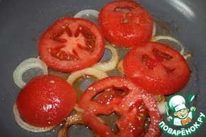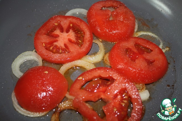 На лук выкладываем помидоры и делаем маленький огонь и под крышкой тушим около 4 минут.