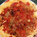 На помидоре сделать надрезы и залить кипятком, дать постоять и снять шкурку. Нарезать кольцами.