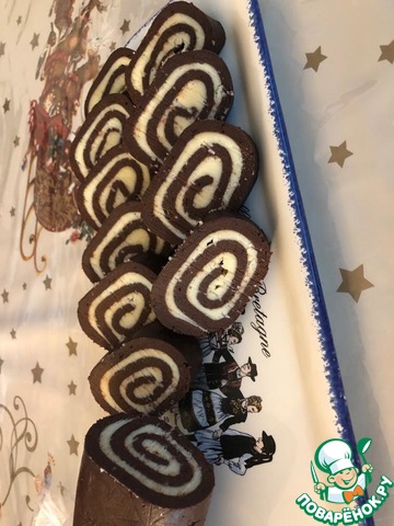 Этот десерт понравился нам всем без исключения, ели мои мужчины и нахваливали. Идея: приготовить 2 рулета впрок до ДР, например, и хранить в морозилке. Пока угощаемся основным блюдом, рулет достаём, он подтает и хорошо отрезается. Длина рулета-30 см