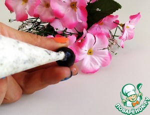Достать маслины из томатного соуса, соус оставить. Начинку положить в кондитерский мешок. Начинить все маслины.