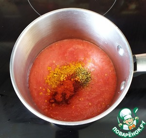 Далее, готовим соус. Перелить протертые томаты в сотейник, добавить хмелели-сунели, карри, паприку и соль. Поставить на средний огонь и варить 4-5 минут.