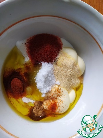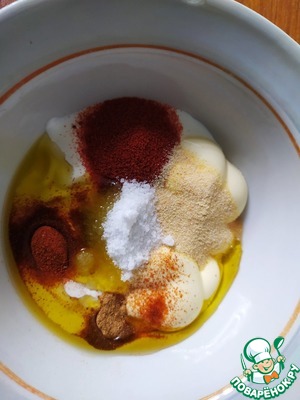 Для маринада смешать оливковое масло, томатный соус, сметану и майонез. Всыпать соль и специи.